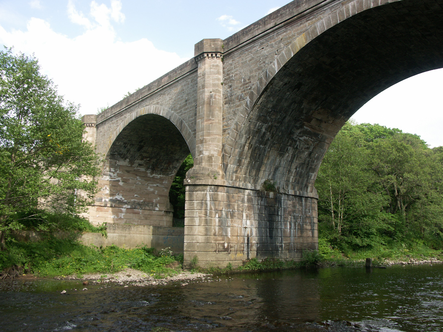 It has four segmental spans and a semicircular flood arch on the west side. The piers have semi-hexagonal pillars above them which rise to make refuges at the parapet level. These refuges are corbelled which gives the effect of castle towers, in line with Mitchell's usual style when building railways in the Highlands. [1]